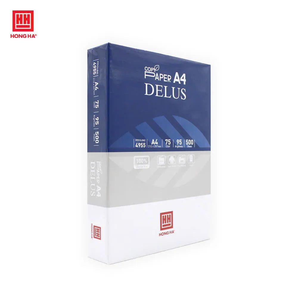 Sản phẩm ưu việt và chất lượng: Đạt trắng 95% cao nhất thị trường. Giấy không bụi, giúp đảm bảo sức khỏe người sử dụng và tăng độ bền của máy in, máy photo. Giấy in A4 Hồng Hà Delus 75gsm - 4955 phù hợp với đa dạng thiết bị máy in, máy photo và đa dạng mục đích sử dụng.